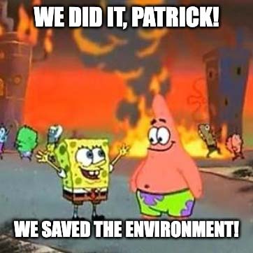 This SpongeBob SquarePants meme shows the characters rejoicing while everything around them is destroyed. Caption variations mock token efforts that barely fix a problem. Gen Z uses it to critique feel-good environmentalism – like banning plastic straws and then declaring victory while oceans fill with trash. The sarcastic punchline: “We did it, Patrick! We saved the city!” (as the city crumbles).
